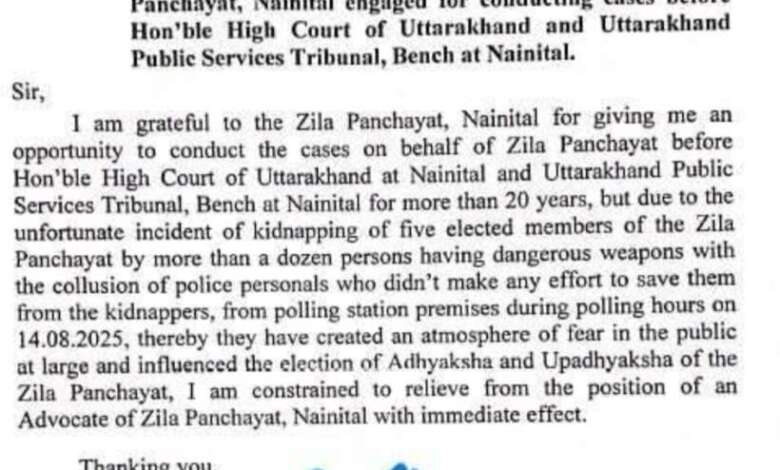 जिला पंचायत अध्यक्ष चुनाव को लेकर विगत 14 अगस्त को नैनीताल में हुए घटनाक्रम को लेकर जिला पंचायत के अधिवक्ता रवींद्र सिंह बिष्ट ने अपने पद से इस्तीफा दे दिया है। अपने इस्तीफे में उन्होंने लिखा है कि “महोदय, मैं जिला पंचायत, नैनीताल का आभारी हूँ कि उन्होंने मुझे 20 वर्षों से अधिक समय तक माननीय उत्तराखंड उच्च न्यायालय, नैनीताल और उत्तराखंड लोक सेवा अधिकरण, नैनीताल पीठ में जिला पंचायत की ओर से मुकदमों का संचालन करने का अवसर दिया। किन्तु दिनांक 14.08.2025 को मतदान समय के दौरान मतदान केंद्र परिसर से पुलिस कर्मियों की मिलीभगत से खतरनाक हथियारों से लैस एक दर्जन से अधिक व्यक्तियों द्वारा जिला पंचायत के पाँच निर्वाचित सदस्यों का अपहरण करने की दुर्भाग्यपूर्ण घटना के कारण, जिन्होंने उन्हें अपहरणकर्ताओं से बचाने का कोई प्रयास नहीं किया, जिससे आम जनता में भय का माहौल पैदा हो गया और जिला पंचायत के अध्यक्ष एवं उपाध्याक्ष के चुनाव प्रभावित हुए। अतः मैं तत्काल प्रभाव से जिला पंचायत, नैनीताल के अधिवक्ता के पद से मुक्त होने के लिए बाध्य हूँ। धन्यवाद।