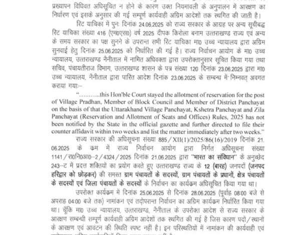 राज्य निर्वाचन आयोग द्वारा उत्तराखण्ड राज्य के 12 जनपदों (जनपद हरिद्वार को छोड़कर) की समस्त ग्राम पंचायतों के सदस्यों, ग्राम पंचायतों के प्रधानों, क्षेत्र पंचायतों के सदस्यों एवं जिला पंचायतों के सदस्यों के निर्वाचन का कार्यक्रम उच्च न्यायालय, उत्तराखण्ड, नैनीताल के अनुपालन में 25.06.2025 से होने वाली नामांकन समेत अन्य कार्यवाहियों अग्रिम आदेशों तक स्थगित कर दीं हैं। इस संबंध में राज्य निर्वाचन आयुक्त सुशील कुमार ने एक अधिसूचना जारी की है।