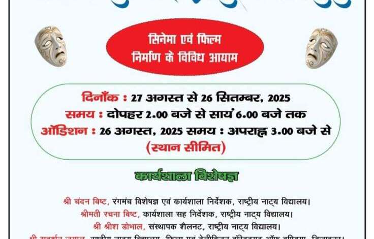 राष्ट्रीय नाट्य विद्यालय नई दिल्ली और शैलनट हल्द्वानी के संयुक्त तत्वावधान में आनंदा अकादमी में आयोजित होने वाली तीस दिवसीय अभिनय एवं नाट्य प्रशिक्षण कार्यशाला के लिए आज (26 अगस्त) को आनंदा अकादमी में आडीशन लिए जायेंगे।