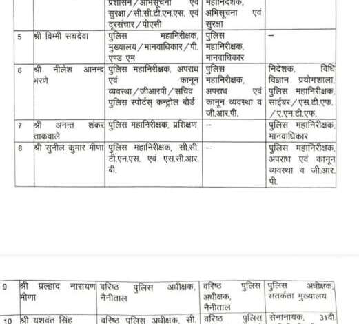 एसएसपी सीआईडी यशवंत सिंह अब सेनानायक 31वीं वाहिनी पीएसी होंगे। नैनीताल के एसएसपी प्रह्लाद नारायण मीणा अब एसपी विजिलेंस मुख्यालय होंगे जबकि एसपी अभिसूचना मुख्यालय मंजूनाथ टीसी को एसएसपी नैनीताल बनाया गया है। एसएसपी पौड़ी गढ़वाल लोकेश्वर सिंह को एसपी पुलिस मुख्यालय बनाया गया है जबकि एसपी मुख्यालय कमलेश उपाध्याय को एसपी उत्तरकाशी की कमान दी गई है। एसपी चमोली सर्वेश पंवार एसएसपी पौड़ी गढ़वाल होंगे। एसपी उत्तरकाशी सरिता डोबाल को एसपी अभिसूचना मुख्यालय बनाया गया है। एसपी एटीसी सुरजीत सिंह पंवार को एसपी चमोली की जिम्मेदारी दी गई है। वहीं पीपीएस अफसरों में एएसपी हल्द्वानी प्रकाश चंद्र को पीटीसी नरेंद्र नगर का उप प्रधानाचार्य बनाया गया है। उनकी जगह एएसपी पीटीसी मनोज कुमार कत्याल हल्द्वानी के एएसपी होंगे। एएसपी एसटीएफ स्वप्न किशोर सिंह को एएसपी काशीपुर, मनीषा जोशी को उप सेनानायक 40वीं वाहिनी पीएसी हरिद्वार, एएसपी काशीपुर अभय सिंह को एएसपी हरिद्वार, एएसपी सीआईडी कमला बिष्ट को एएसपी विजिलेंस हल्द्वानी, एएसपी विकास नगर रेनू लोहानी को उप सेनानायक आईआरबी द्वितीय देहरादून और एएसपी हरिद्वार पंकज गैरोला को एएसपी विकासनगर बनाया गया है।